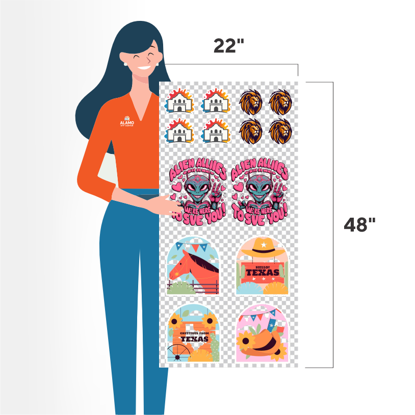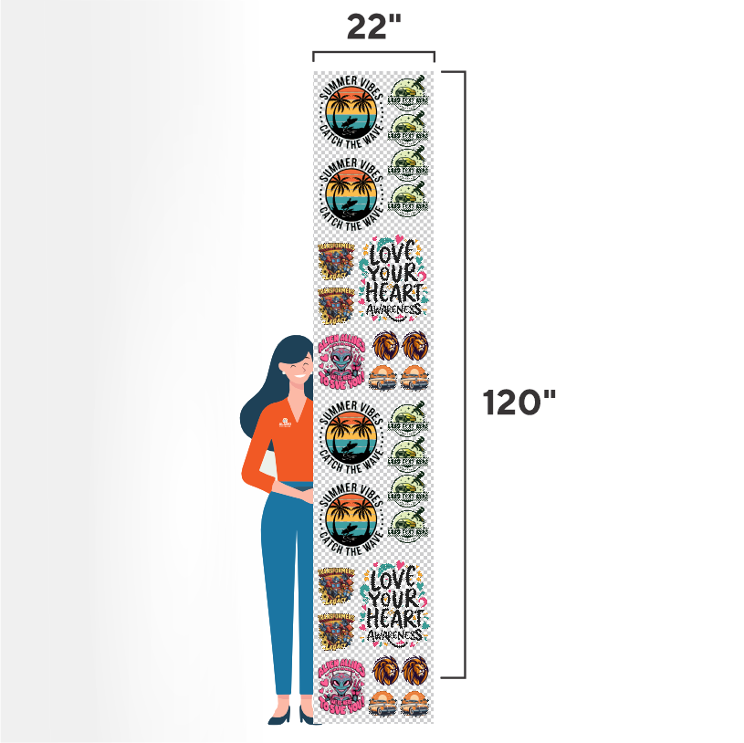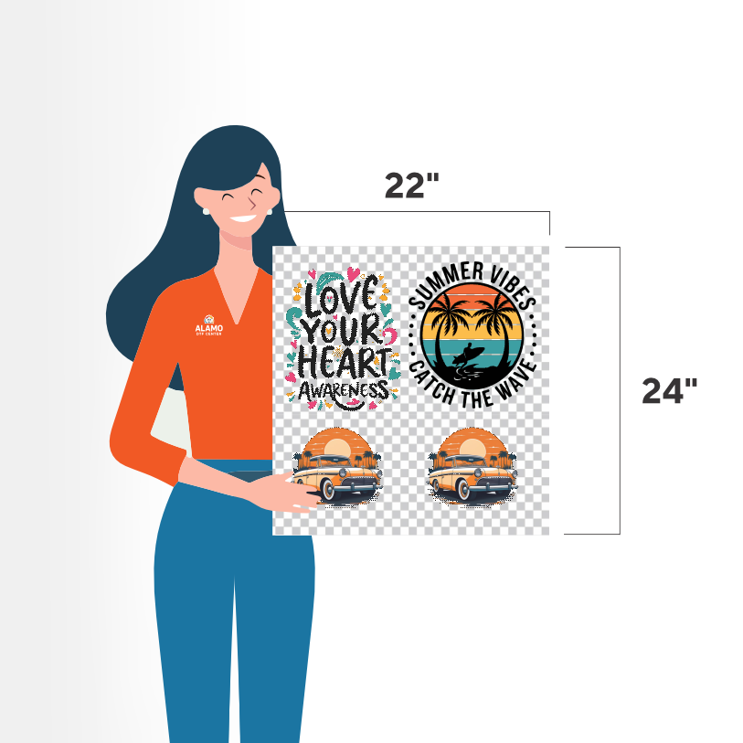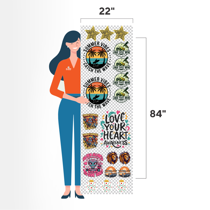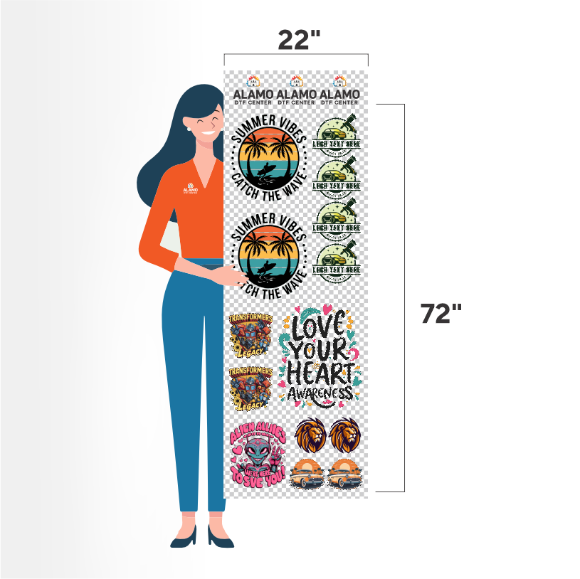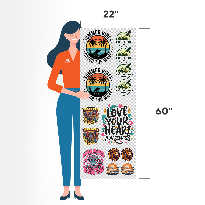 Upload your ready-to-print file (AI, PNG, PDF) to create vibrant and durable Alamo DTF Center Gang Sheets. If you don’t have a print-ready file, use our Free Gang Sheet Builder for an easy design creation process.